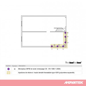 Intervention : Consolidation des fondations sur environ 06 mètres linéaires avec n° 06 micropieux MP60 (marquage CE selon directive européenne EN 1090-1:2009) et n° 04 injections de résine KERASTABLE® à haute densité de type HDR® (Polymères expansifs) en libre diffusion sur n° 01 niveau de profondeur et n°02 injections sur 02 niveaux de profondeur.