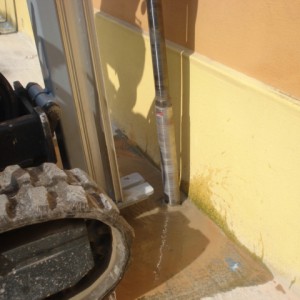 - La deuxième phase consiste à installer des micropieux à enfoncement par pression à l'aide d'un vérin hydraulique équipé d'un manomètre permettant de lire la pression nécessaire pour enfoncer les modules en acier dans le terrain et, par conséquent, de tester individuellement la portance de chaque micropieu. Le piston d’enfoncement utilisé est capable d’exercer une charge d’enfoncement sur la tête du micropieu correspondant à un maximum d’environ 25 tonnes. Lorsque le micropieu rencontre une couche capable de contraster la pression exercée par le vérin hydraulique sur les modules en acier, le vérin hydraulique est retiré et le micropieu MP60 est définitivement cimenté à l’intérieur de la fondation.
