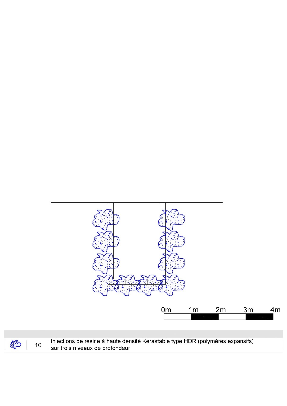 Itervention: Traitement du sol d'assise des fondations sur environ 06 mètres linéaires avec n° 10 injections de résine KERASTABLE® à haute densité de type HDR® (Polymères expansifs) en libre diffusion sur n° 3 niveaux de profondeur